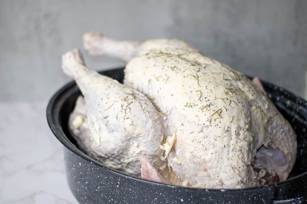 - Mix butter and herbs. – Whip up a herbed butter by mixing the softened butter, rosemary, and thyme together. Slather the butter mixture all over the outside of the turkey. If you can slide your hands under the skin it’s best to tuck some in there too.